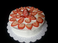 Slice the cake into two. Spread the whipped cream on the cut side of each slice of the cake; pour the vanilla strawberries on one piece making sure not to go too much over the edge of the cake. Cover it with the other half and spread the remaining whipped cream evenly on top and around the cake. Garnish the top of the cake with whole or sliced strawberries, sprinkle some icing sugar on the strawberries to give a little glaze.