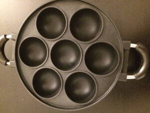 - Heat the vitumbua pan on low heat, grease lightly each cavity with oil using a pastry brush.