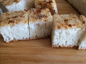 - Let it cool completely and cut into 11/2 inch squares. The perfect mkate siniya should have air pockets running lengthwise and should be soft.