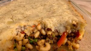 Mix the pasta into the ground beef mixture and add Worcestershire sauce, tomato ketchup and sliced bell pepper. Put the meat mixture in an ovenproof dish. Spread a layer of mashed potatoes over it or pipe rosettes. Bake in a preheated oven at 350F for 20 to 25 minutes or until potatoes are light brown. Serve hot.